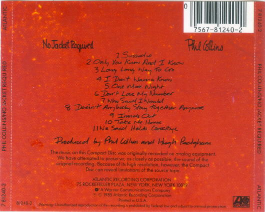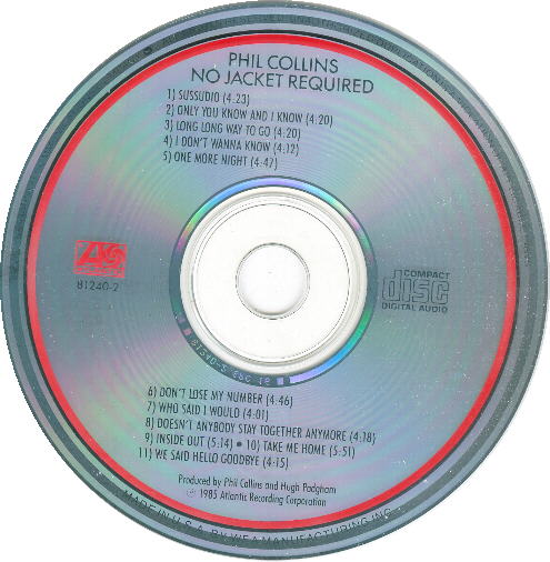In fact, 'No Jacket Required' was the first CD produced by the WEA plant, September 1986.